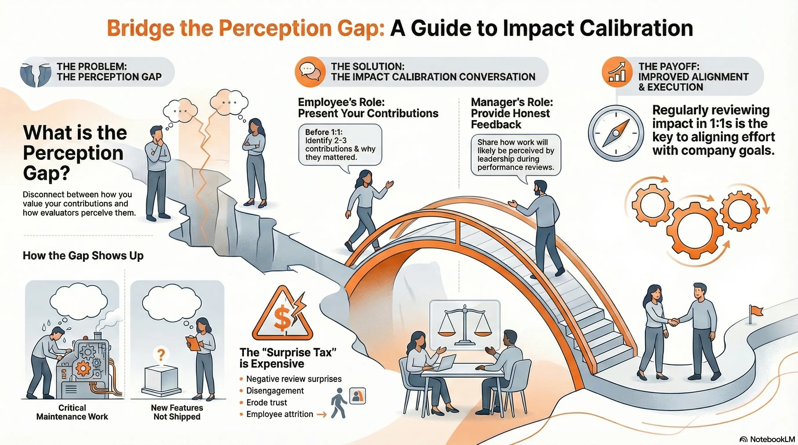 The core of the Impact Calibration is making perception alignment a regular part of manager-employee 1:1s. Not a separate meeting. Not an additional process. Just a different focus for conversations that should already be happening.